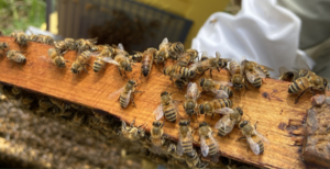 Vårinspektion, här kontrollerar vi hur bina i samhället klarat övervintringen. På bilden ser vi arbetarbin, drönare och drottningen som alla klarat sig fint och är ett ovanligt starkt samhälle för att vara tidigt på våren.