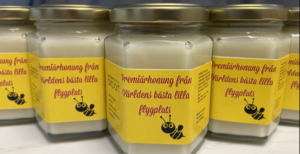 Premiärhonung, en len och nästan vit rapshonung som är skattad några dagarna innan midsommar 2020. Även slungningen och tappningen på burkarna är gjord på flygplatsen, en verkligt lokalproducerad honung!